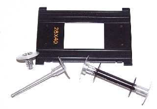Shown below is the masking plate that fits into the film-gate on some of the 620 film 6 x 9cm-format cameras, and the two spool adaptors. This specific adapter was supplied with some Kodak Pathé cameras to enable the use of 828 film in 620 format cameras.